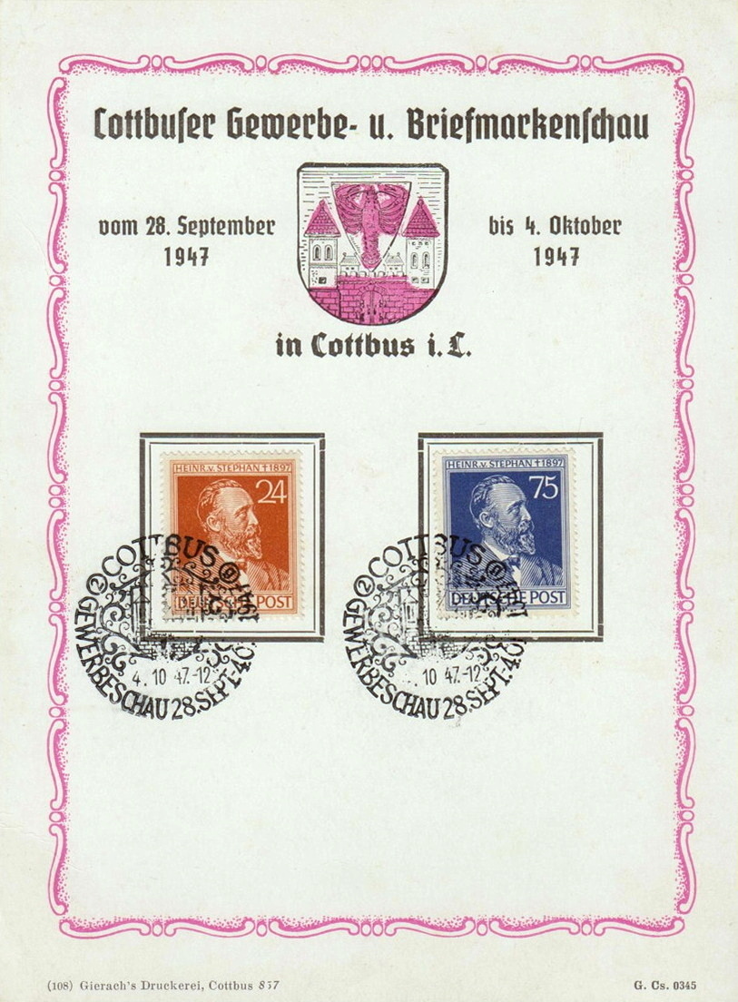 Aufnahme-Motiv: Briefmarken-Ersttagsblatt der "Cottbuser Gewerbe- u. Briefmarkenschau vom 28. Sptember - 04. Oktober 1947" (108 Gierach`s Druckerei, Cottbus 837)